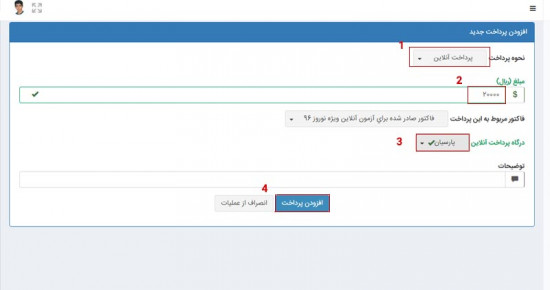 6- در صفحه ی بعدی ، نحوه ی پرداخت را روی پرداخت آنلاین قرار دهید، سپس مبلغ 20000 ریال را در محل مشخص شده وارد کنید ، درگاه پرداخت آنلاین را ، پارسیان انتخاب کرده و در انتها افزئدن پرداخت را کلیک کنید.