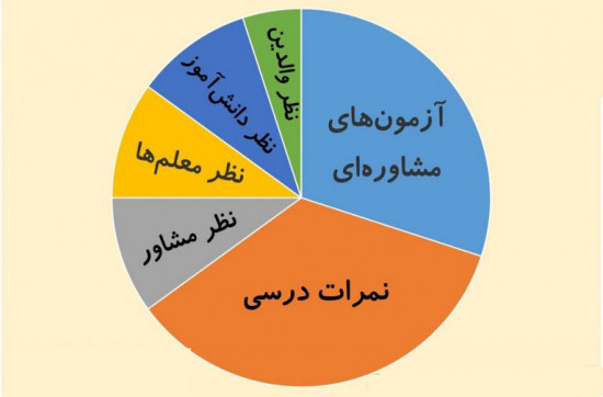 همونطور که در نمودار دایرهای بالا میبینید، تأثیر همهی عواملی که در انتخاب رشته دبیرستان بهشون توجه میشه مشخص شده و در بین این عوامل طبق چیزی که در ابتدای این مقاله هم گفتم، تأثیر آزمونهای مشاورهای تقریباً با تأثیر نمرات درسی مساویه و عوامل دیگه هم مثل نظر مشاور و معلم و خودِ دانشآموز و والدین هم در انتخاب رشته دبیرستان سهم خودشون رو دارن.