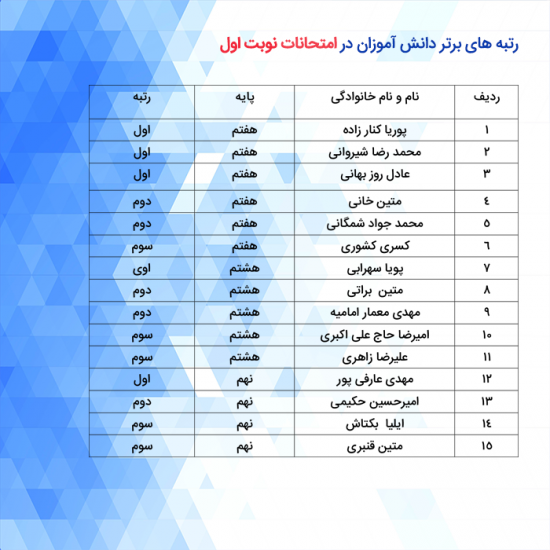 اسامی دانش آموزان برتر در امتحانات نوبت اول 98